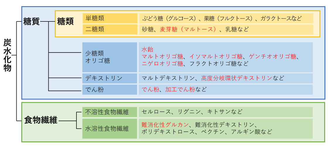 糖類は単糖類(ぶどう糖や果糖など)と二糖類(砂糖や麦芽糖など)の総称で、糖質に含まれます。