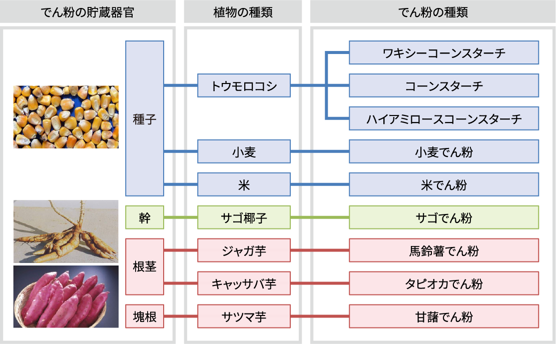 でん粉の種類としては、トウモロコシの種子から精製されるコーンスターチ、サゴ椰子の幹から精製されるサゴでん粉、キャッサバ芋の芋(根茎)から精製されるタピオカでん粉などがあります。