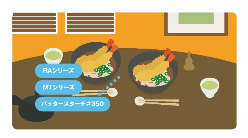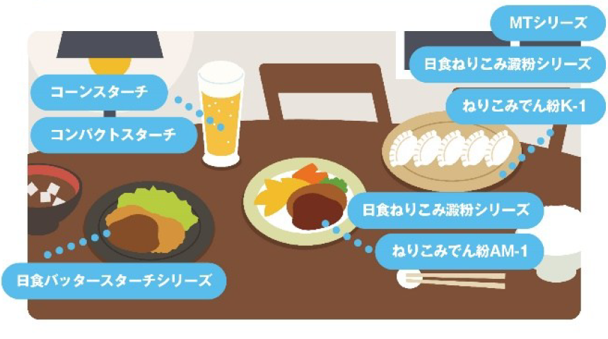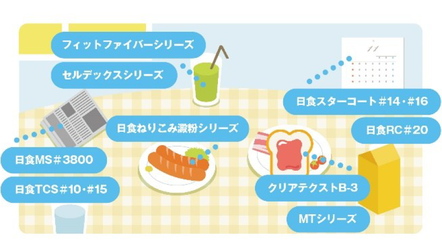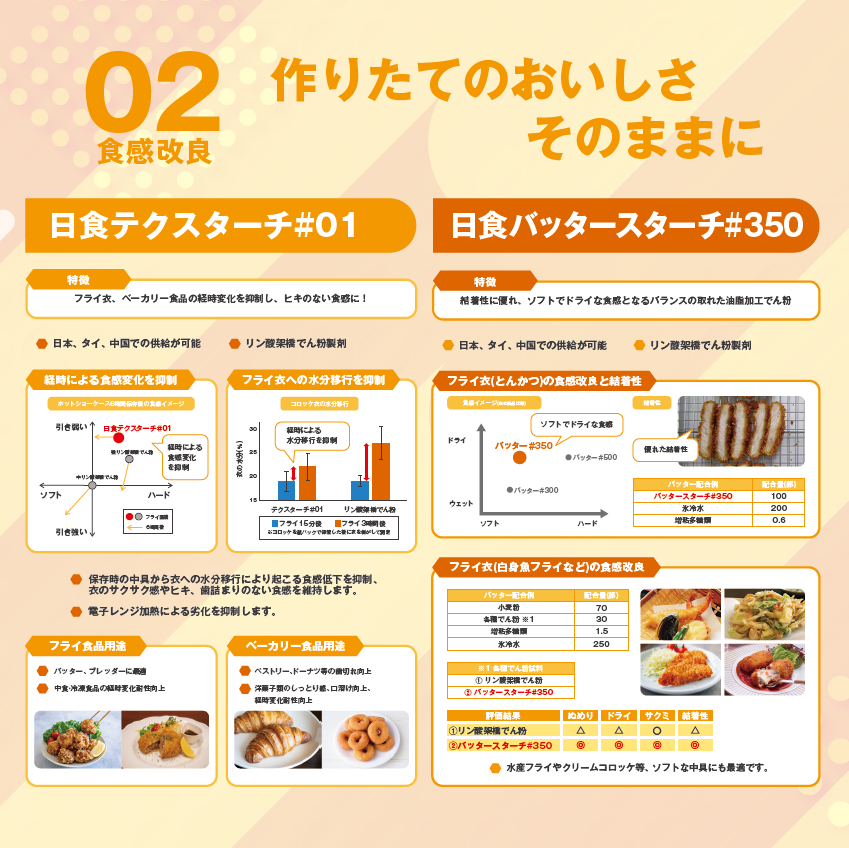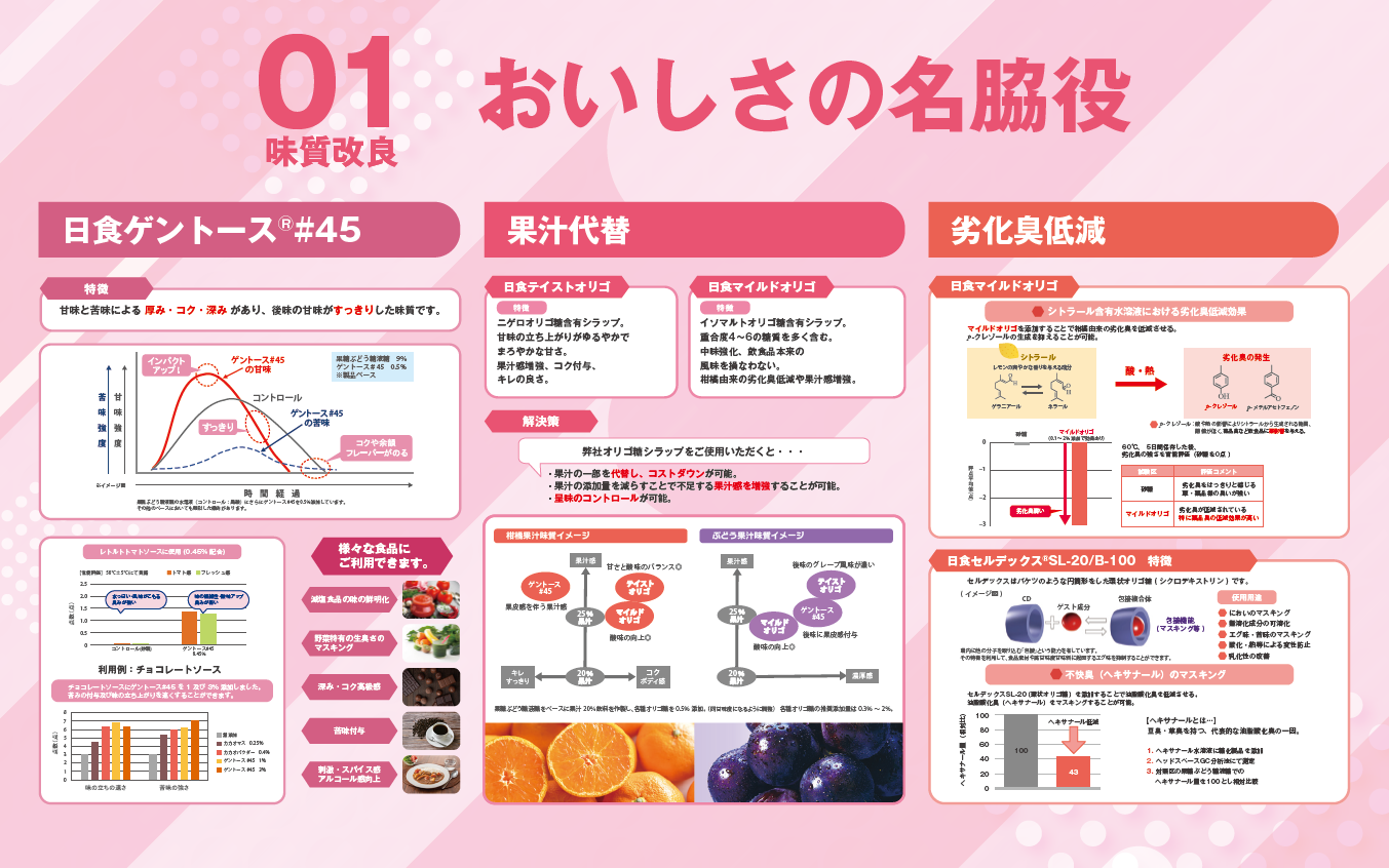 食品開発展2024 東京ビッグサイト西1・2・4 ホール&アトリウム2024年10月23日(水)〜25日(金)10:00〜17:00 展示内容Contents 詳しく見る 味質改良 中味向上に最適なオリゴ糖 日食マイルドオリゴ 主成分:α-1,6結合分岐オリゴ糖(重合度4-6の糖質を高含有) 味質:風味を損なわず自然でマイルドな味質(甘味度約25%) 詳しく見る 味質改良 苦みのあるオリゴ糖 日食ゲントース#45 糖質には珍しいキレの良い苦味を有するゲンチオオリゴ糖を含むグルコオリゴ糖です。苦味付与効果のほか、隠し味として用いることで果汁感増強効果や渋味低減効果などを有します。 詳しく見る 食感改良 陳列、レンジ加熱後もサクサクに! 日食テクスターチ#01 揚げ物衣の食感改良を目的としたタピオカ加工でん粉です。 常温陳列時やレンジ加熱後も良好な食感を維持します。 衣の食感をサクサクとしたひきのない食感にします。 詳しく見る ここにもある!日本食品化工 日本食品化工の製品は日々の食卓で活躍しています。 お問い合わせ