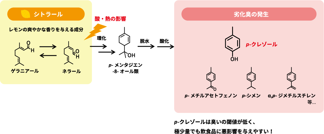 レモンなど柑橘類に多く含まれる香気成分のシトラールは、酸や熱などの影響で劣化臭の原因成分となるp-クレゾールなどを生成します。