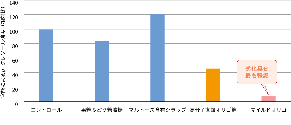 マイルドオリゴを添加することで、柑橘由来の劣化臭を低減させます。特にp-クレゾールの生成を低減させることができます。また、マイルドオリゴは劣化臭(p-クレゾール)のマスキング効果もあります。