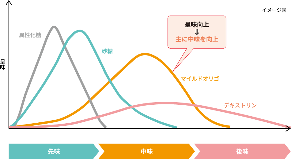 中味向上に最適なオリゴ糖 日食マイルドオリゴ 主成分:α-1,6結合分岐オリゴ糖(重合度4-6の糖質を高含有)味質:風味を損なわず自然でマイルドな味質(甘味度約25%) 日食マイルドオリゴは中味を向上させます 中味 呈味イメージ 柑橘類(レモン)の劣化臭低減効果 詳しく見る 事例紹介 野菜や肉、果肉等の素材感向上 果汁感向上、果汁に頼らない設計のヒントに 乳味感付与、コストダウンに寄与 風味向上で美味しく